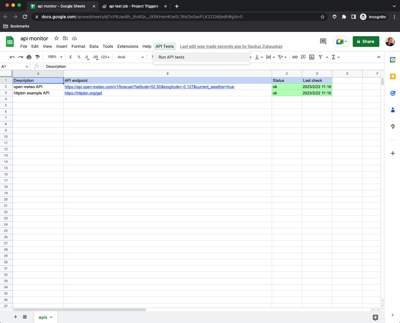 You have now created the simple automated API monitor with Google spreadsheets.